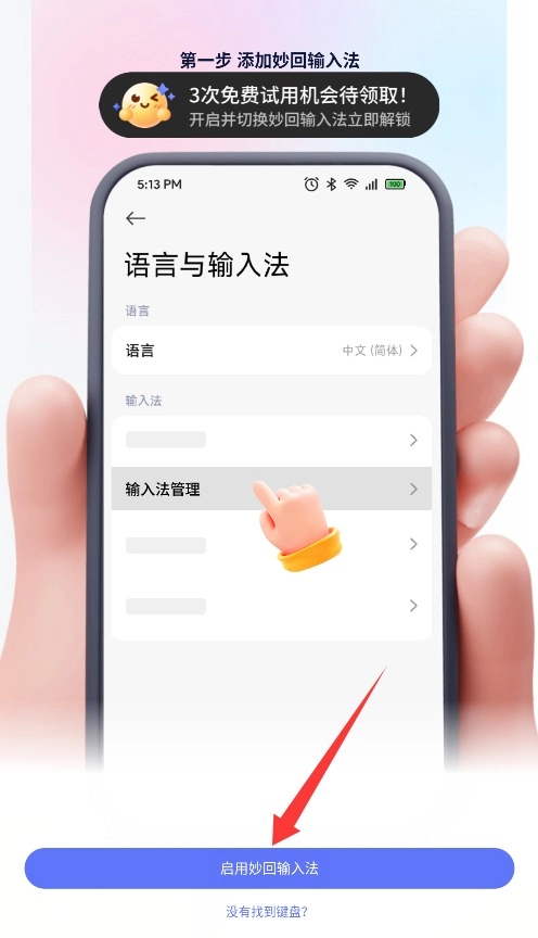 2、在系统设置中找到输入法管理选项,开启妙回输入法的使用权限并设为默认输入方式。