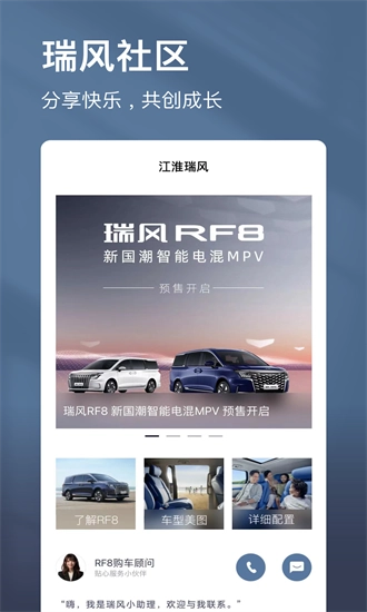 江淮瑞风作为江淮汽车集团打造的一站式智能服务平台,不仅提供线上看车、选车、购车以及预约售后的服务,还具备远程控车、车况查询、配件选购等实用功能。同时,通过整合最新汽车资讯与车型筛选功能,为车主精心营造便捷且贴心的体验。快来一同领略智慧出行的魅力吧!