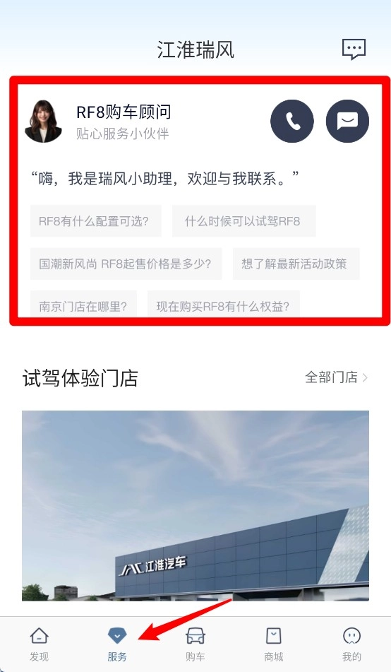2、您可在“服务”页面与顾问展开对话,从而获取配置建议、预约试驾,以及了解活动政策等相关信息。