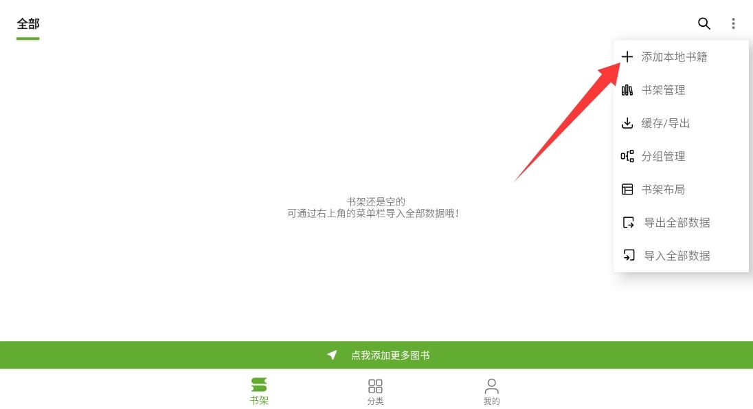 2、进入书架界面后,点击右上角菜单图标展开功能选项,选择"添加本地书籍"功能。