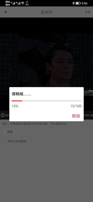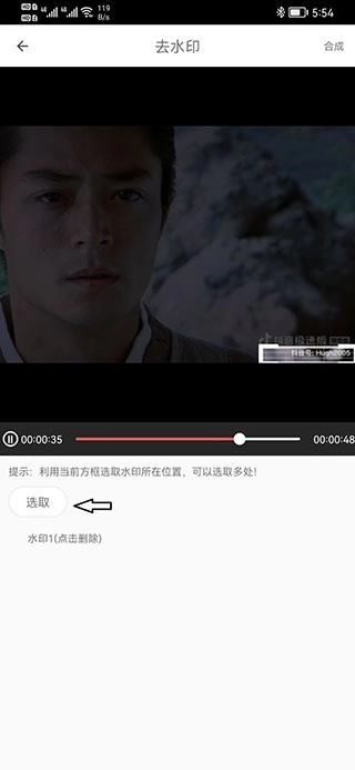 3、去水印操作十分简单。在视频中能看到一个框框,将水印放入其中,接着点击选取,下方就会出现列表。