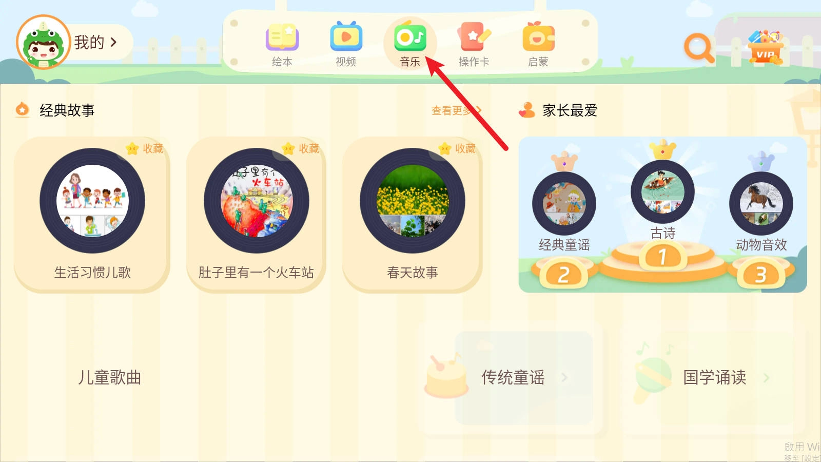 3、在音乐板块聆听童谣故事,激发孩子语言能力。