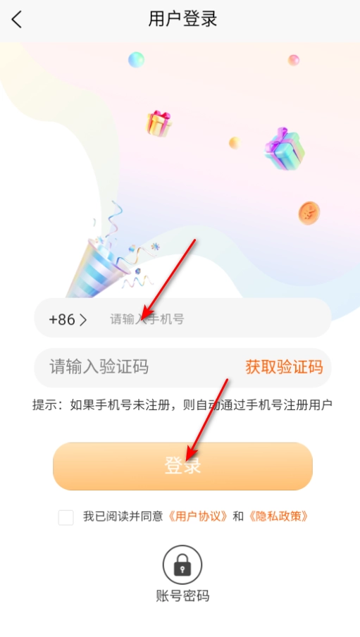 2、输入手机号,获取验证码即可登录