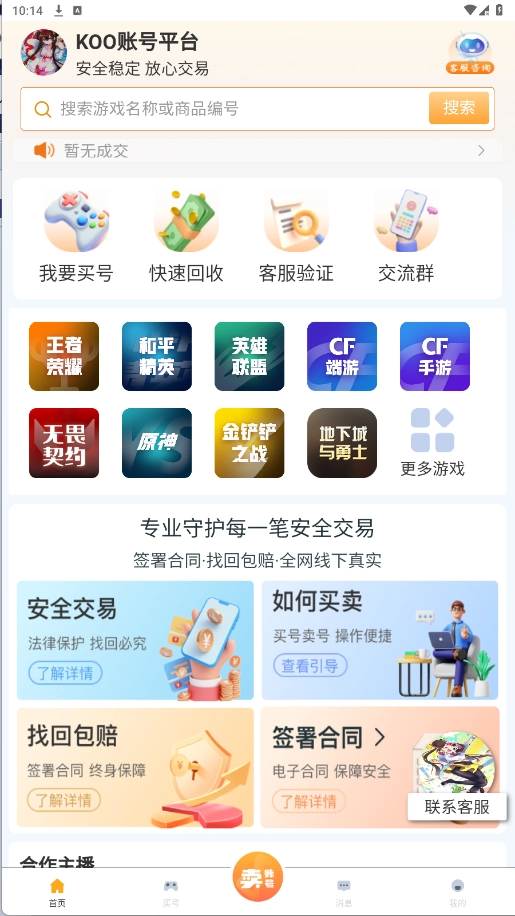 koo账号平台为广大用户提供海量不同类型的游戏账号,用户能够更便捷地在线进行账号交易。在这里,各类游戏账号一应俱全,任您轻松挑选,还能安心在线搜索账号。平台致力于打造更为优质的账号、道具、皮肤等交易服务,涵盖全网热门游戏的账号内容,让用户拥有更优的在线选择,轻松实现线上账号交易。