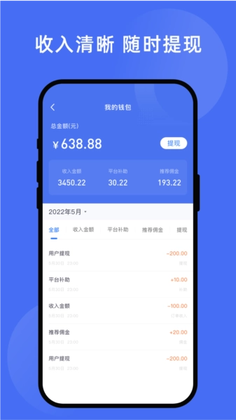 所有接下的并完成的订单都能记录,并能实时了解个人收入情况;