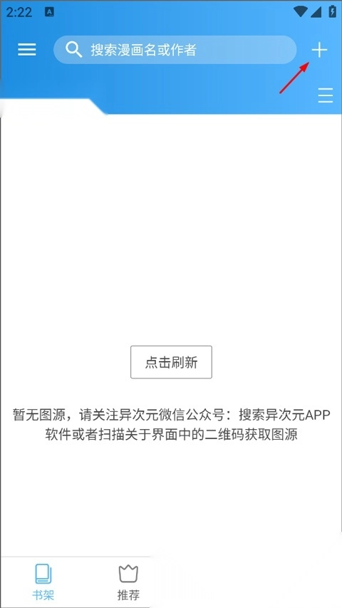 1、用户打开异次元,进入书架页面,点击右上角“+”;