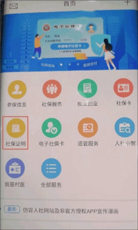 1、首先在首页找到“社保证明”功能选项点击进入。