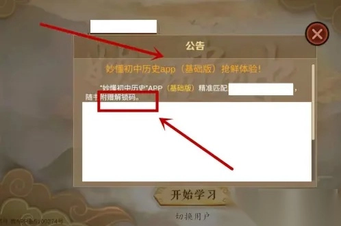 1. 开启妙懂历史App,进入到公告页面,按照公告所给提示来获取解锁码。