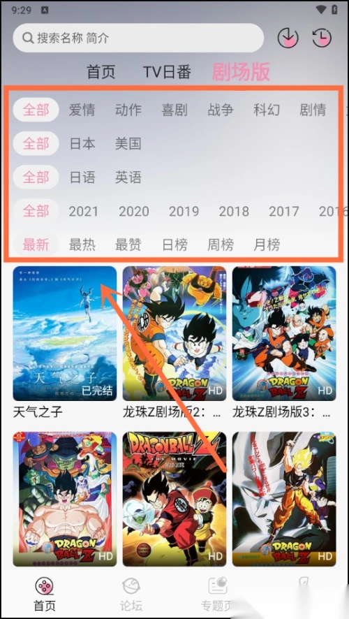 2. 在页面顶部,我们能够选择切换至自己心仪的栏目,比如小编此次选择的是剧场版。随后,还能依据类型、地区、语言、年代、排行榜等诸多条件来进行筛选。