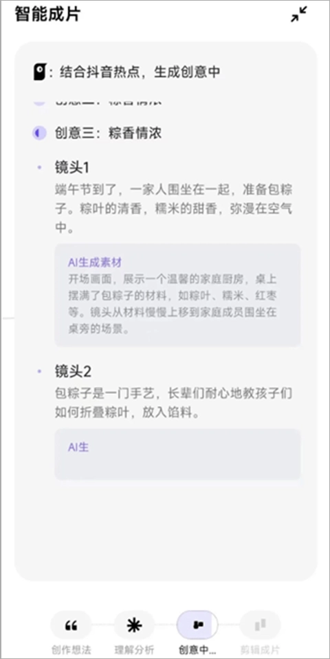 3、自动写创意脚本,生成多个片段后,自动剪辑
