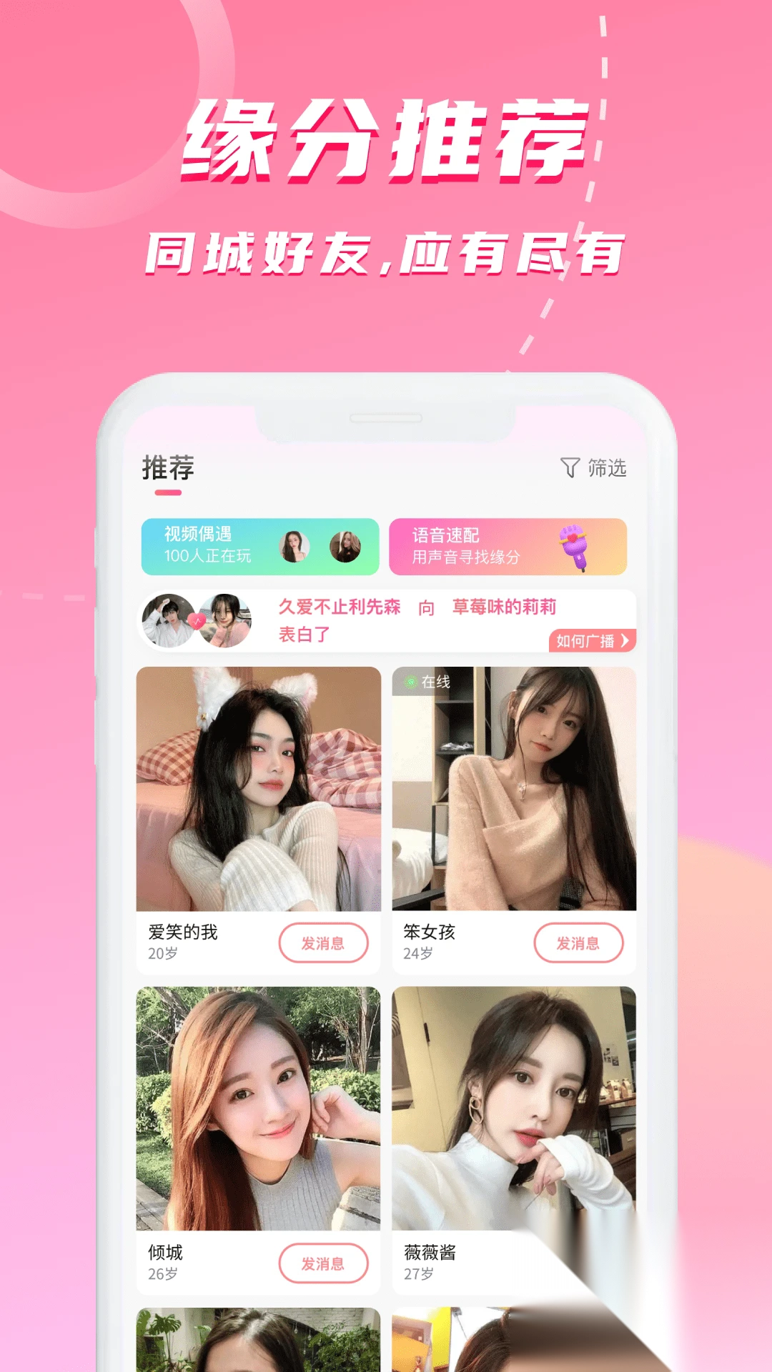 1. 视频爱:身处同城的单身男女,能够借助视频聊天实现实时互动,仿佛面对面般交流,有效增强彼此间的信任感。这种直观的沟通形式,不仅大大拉近了双方的距离,还让初次见面的尴尬荡然无存。