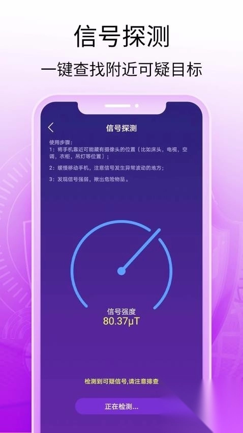 2、一键检测所助酒店房间,快速探测隐藏摄像头