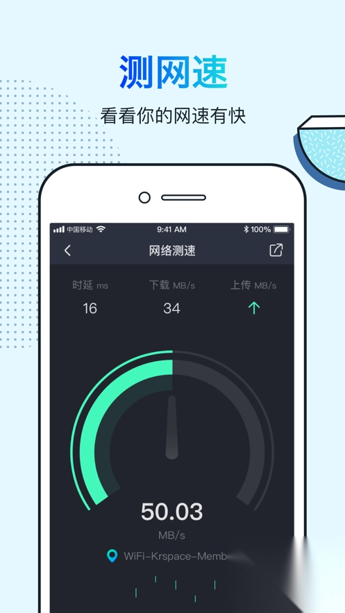 2、测网速,看看你的网速有多快,一键就能测试你的网络速度。