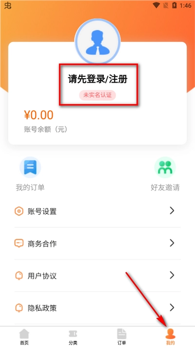 1. 首先点击右下角“我的”选项,接着点击页面上方的“登录/注册”按钮。