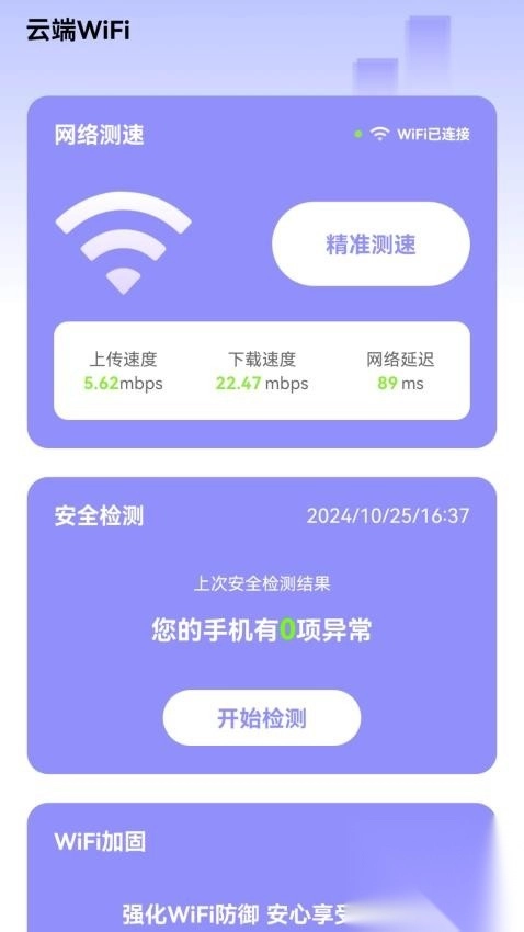 云端WiFi是一款综合性应用软件,融合了WIFI网络安全管理、网络测速以及WIFI加固等功能。该应用致力于为用户打造精准且全面的网络测速服务,与此同时,提升WIFI网络的安全性与稳定性。