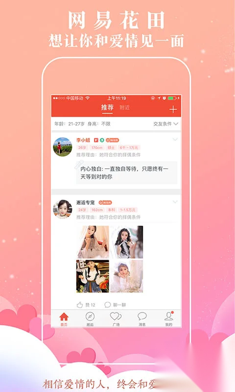 3、征友启事,王婆卖瓜自卖自夸。说不定在网易花田,你的TA 就能看到一位成熟小姐姐与小鲜肉大叔展现出的真实模样。