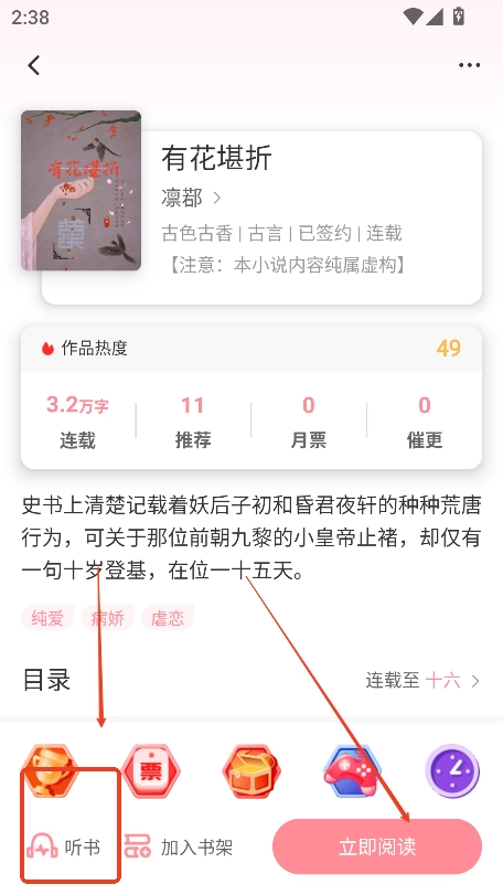 进入喜欢的小说界面,点击立即阅读,可以阅读,点击听书,就可以开始听书啦