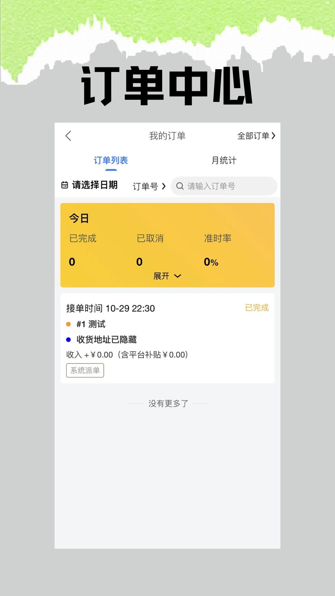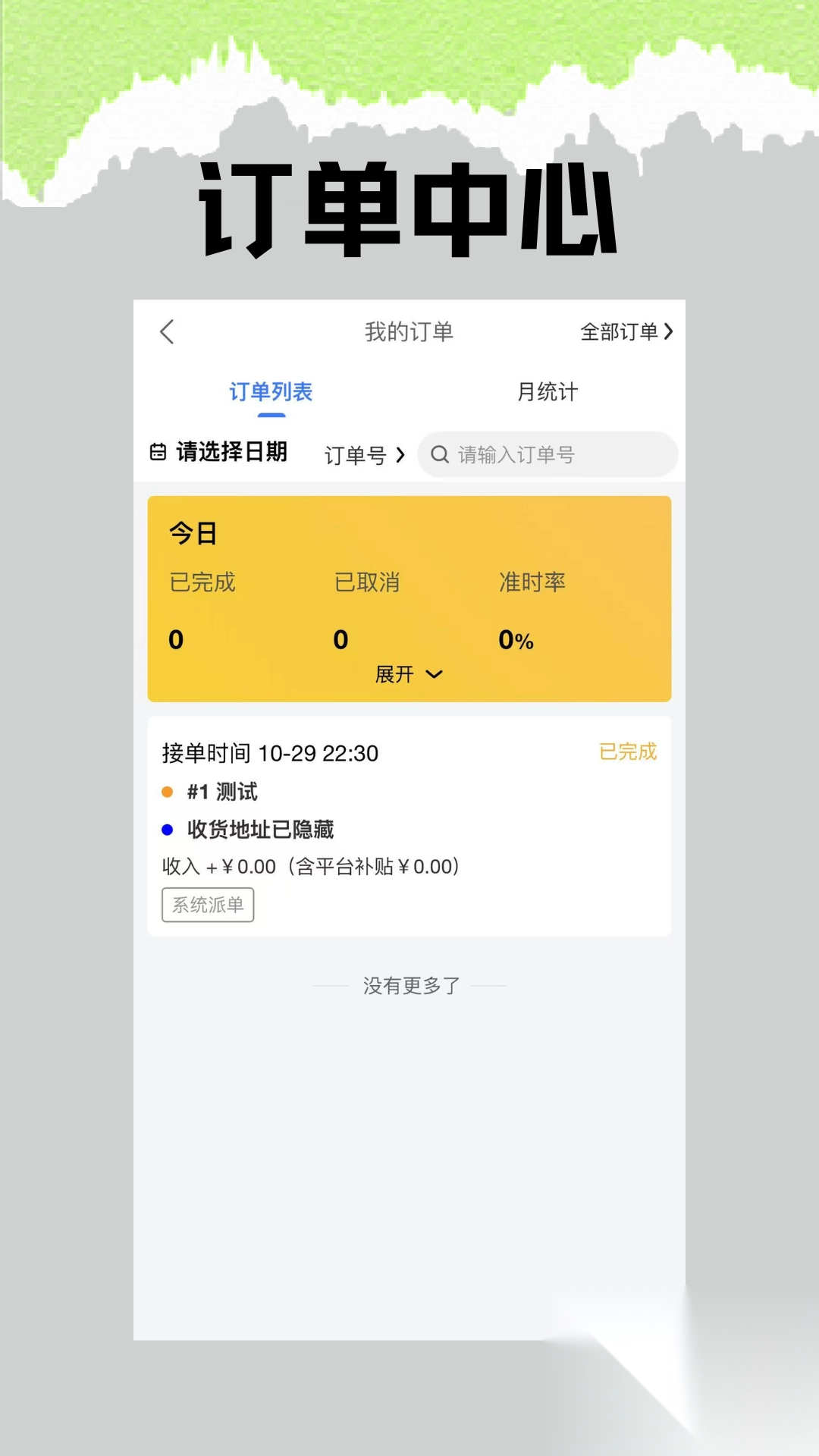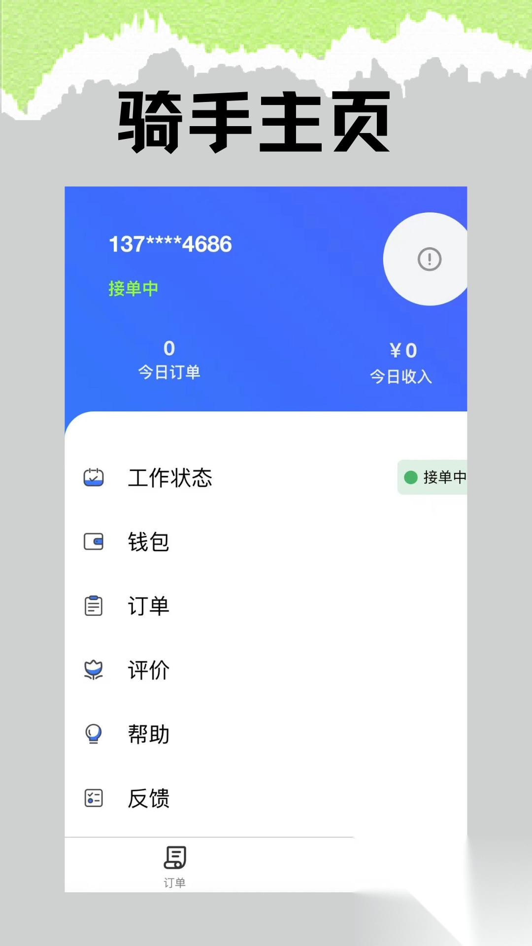 1、首页即订单中心,于“订单”板块,骑手能够方便快捷地查看订单详情、抢单、确认接单,还能标记订单状态,同时可了解今日订单的完成情况与完成状态等。