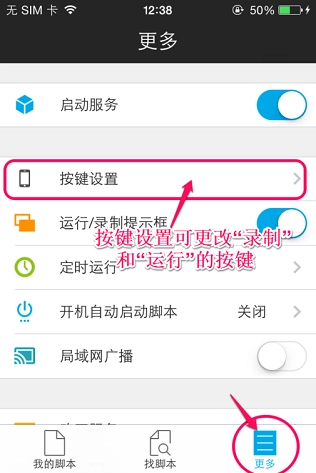 特别提醒:录制与运行脚本的快捷键能够在「更多」-「按键设置」里更改。其默认设置为「+」用于录制脚本,「-」用于运行脚本。