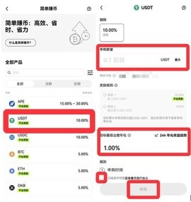 操作步骤如下:打开亿欧交易所,进入首页,点击【金融】板块。进入赚币页面后,您有两种选择,一是依据持有的币种来挑选赚币产品进行申购;二是先选定赚币的产品类型,之后再执行申购操作。接下来以先选择赚币产品类型这种方式为例进行说明。在赚币产品类型中,点击“简单赚币”,随后选择“USDT”。