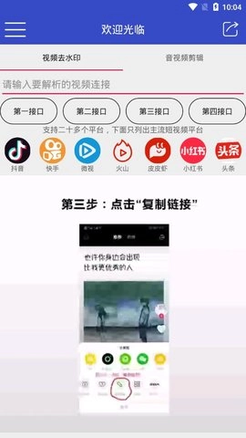支持的平台包括:抖音、皮皮虾、小红书、微博、快手、QQ 小世界、皮皮搞笑、最右、微视、美拍、西瓜视频、哔哩哔哩、虎牙、梨视频以及新片场。