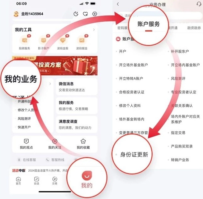 1.登录国金佣金宝,进入“我的”-“我的业务”-账户服务”-“身份证更新”