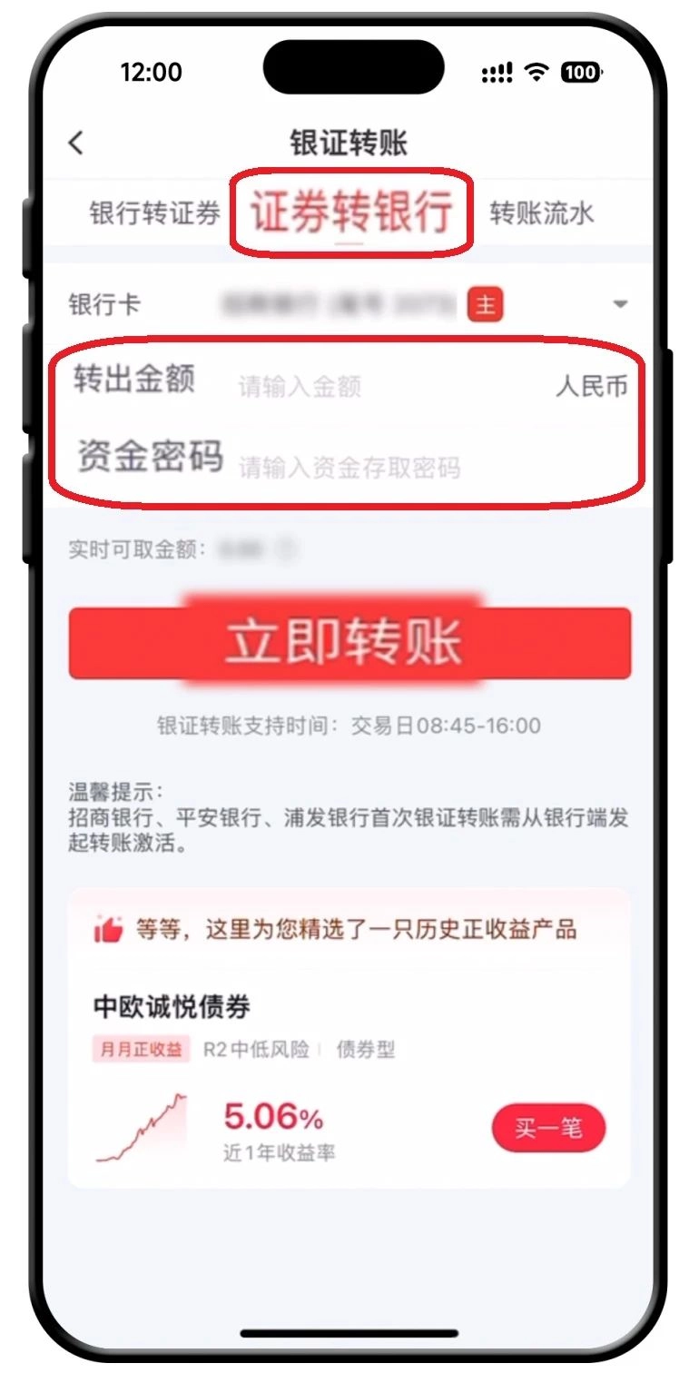 若您选择将证券账户中的资金转入银行卡,需选择【证券转银行】,输入要转入的金额,并输入您开户时设定的资金密码。(注意:部分客户开户时设定资金密码与交易密码一致,在此情况下,输入相同的密码即可。)完成上述操作后,点击【立即转账】便可。