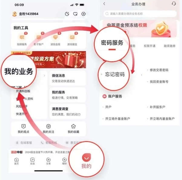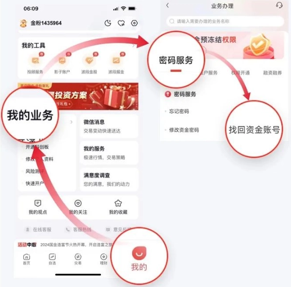 方法二:进入国金佣金宝,点击“我的”-“我的业务”-“密码服务”-“找回资金账号”;