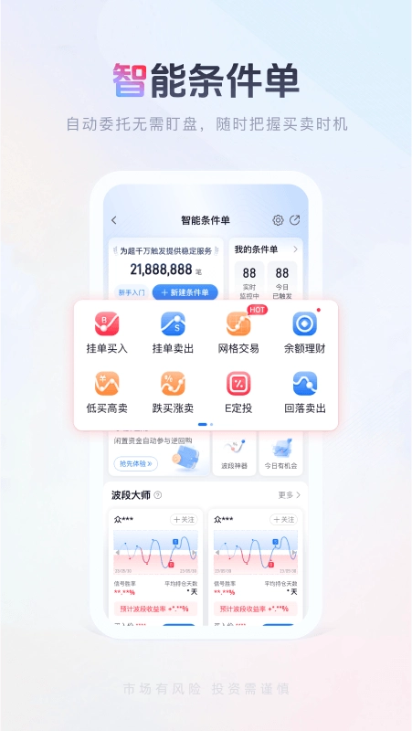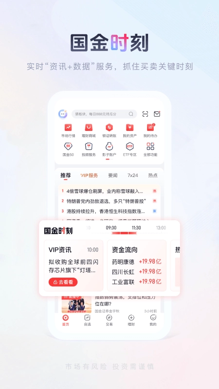 提供沪深A股、B股股票、基金、港股通等各类品种的交易服务。同时,还提供沪深A股、B股、基金、期权、期货、债券,以及港股、美股等主要金融市场的股票交易行情。