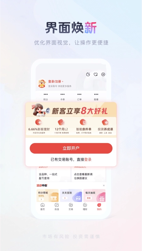 提供7×24小时全天候在线开通沪深A股股票账户服务,同时支持在线开通北交所、港股通、创业板、科创板证券账户以及基金理财等投资权限。