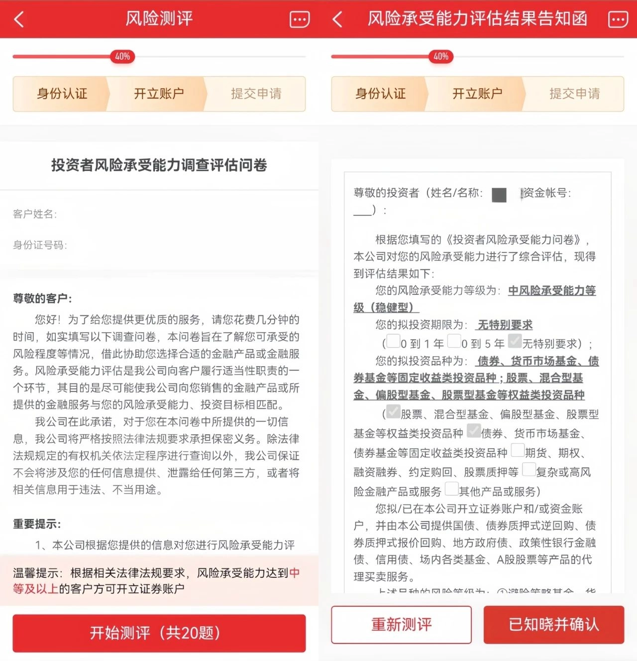 5. 进入风险测评页面,填写并提交【投资者风险承受能力调查评估问卷】。提交后,页面会弹出【风险承受能力评估结果告知函】,请仔细阅读并予以确认。