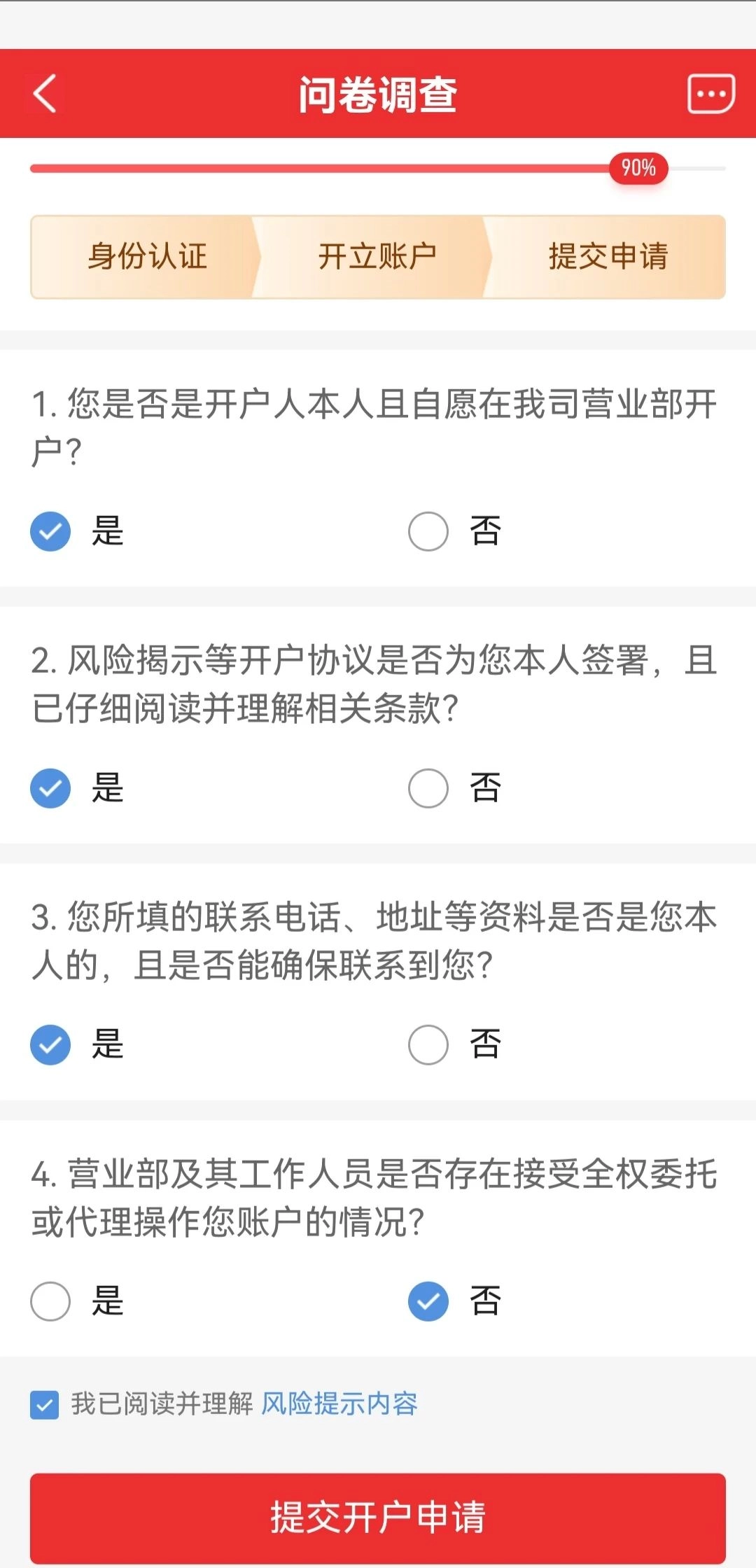10.进入问卷调查页面,完成后,点击【提交开户申请】