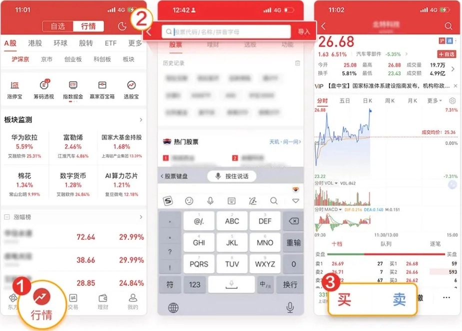 前往【行情】频道,搜索查看个股,在【个股行情】页面点击【买】或【卖】按钮,就能进行委托。