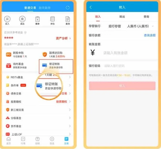 1. 转入资金操作流程:依次点击【交易】-【银证转账】-【转入】,接着输入转账金额就行(部分银行还需输入银行取款密码) 。
