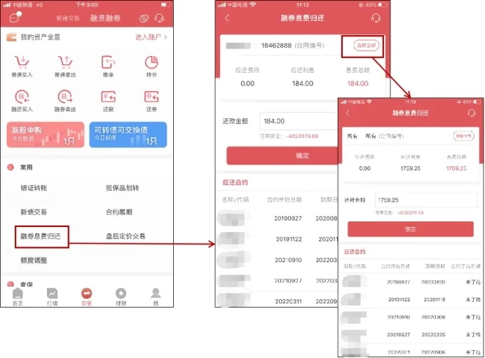 ●功能路径:底部交易-选择顶部融资融券-融券息费归还