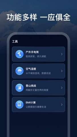 3、无论白天黑夜,用户都可便捷使用这些工具。其中,GPS实时测海拔功能进一步提高了户外活动的安全性与便利性。