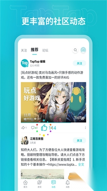 1、游戏交流社区:依托社区的力量展开评价与讨论,挖掘更多让人兴奋不已的游戏。