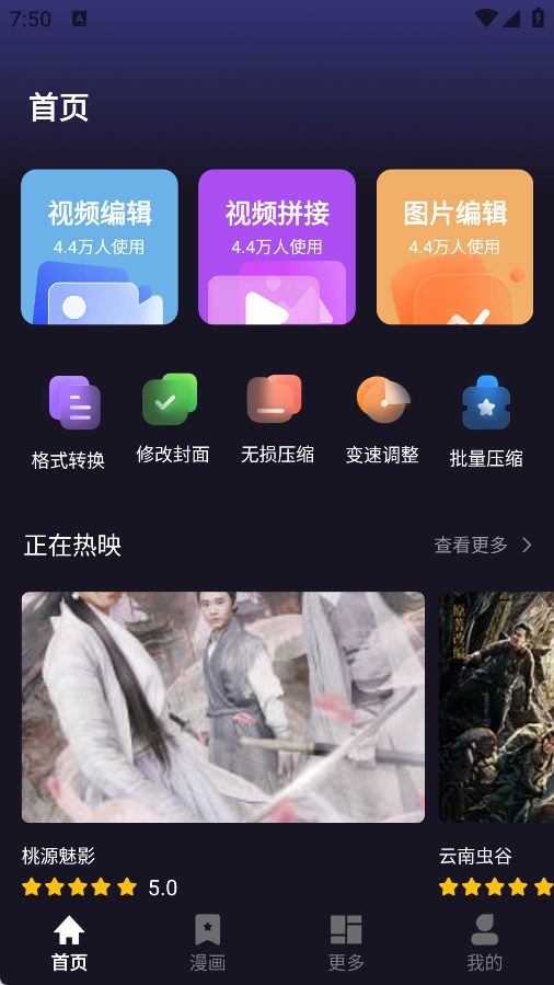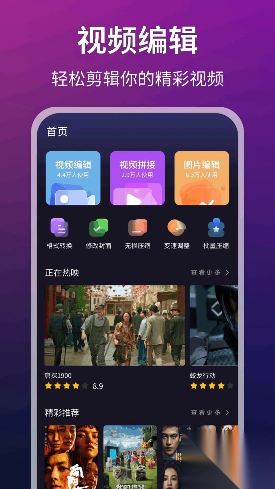 1、首页具备视频编辑、视频拼接以及图片编辑等功能,此外还有大量正在热映的影视资源。