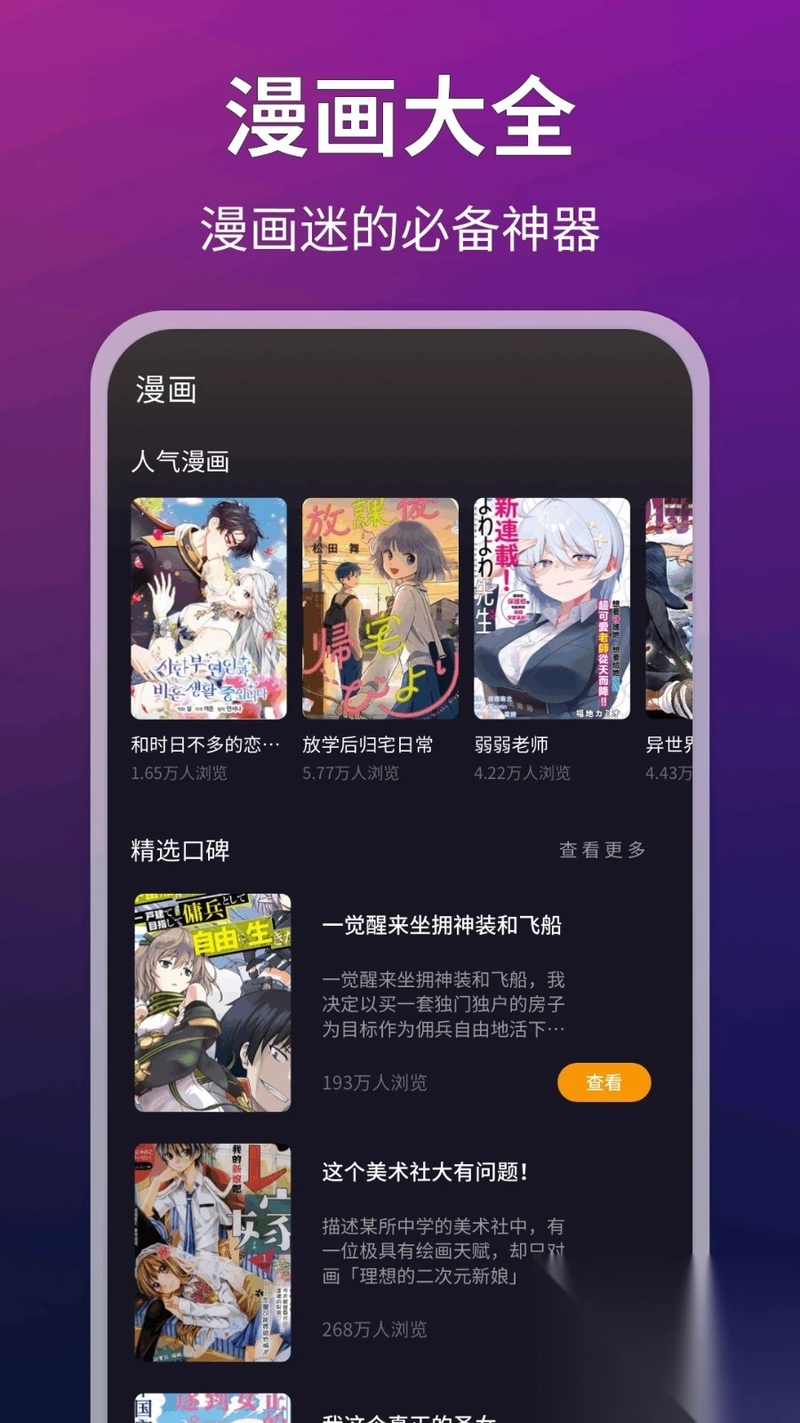 2、漫画板块涵盖人气漫画、精选口碑漫画等丰富内容,让你随时随地畅享各类精彩好看的漫画资源。
