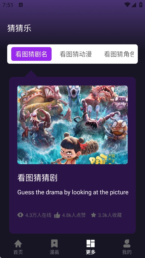 3、在更多页面中有看图猜剧名、看图猜动漫以及看图猜角色等内容。