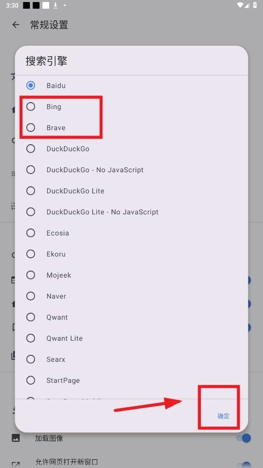 4、轻点搜索引擎,从中挑选想要切换的搜索引擎选项,随后点击“确定”。