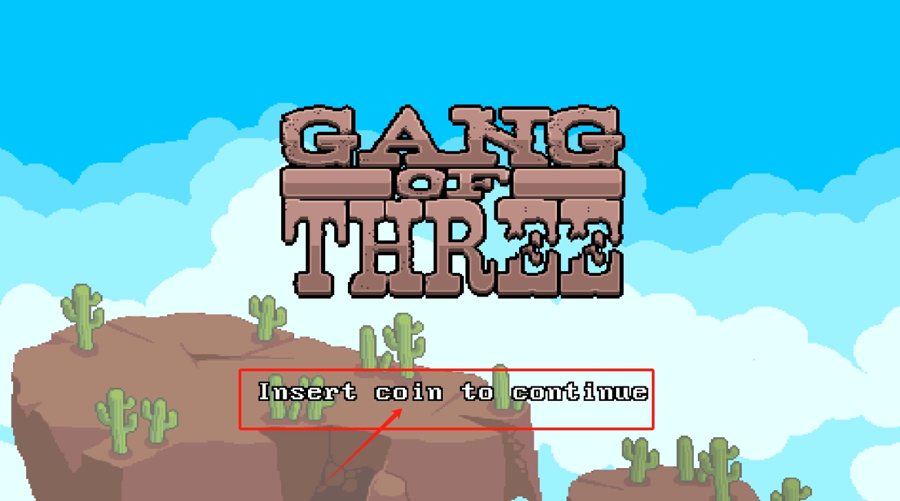 1、投币才能开始游戏,界面显示GANG OF THREE和插入硬币提示。