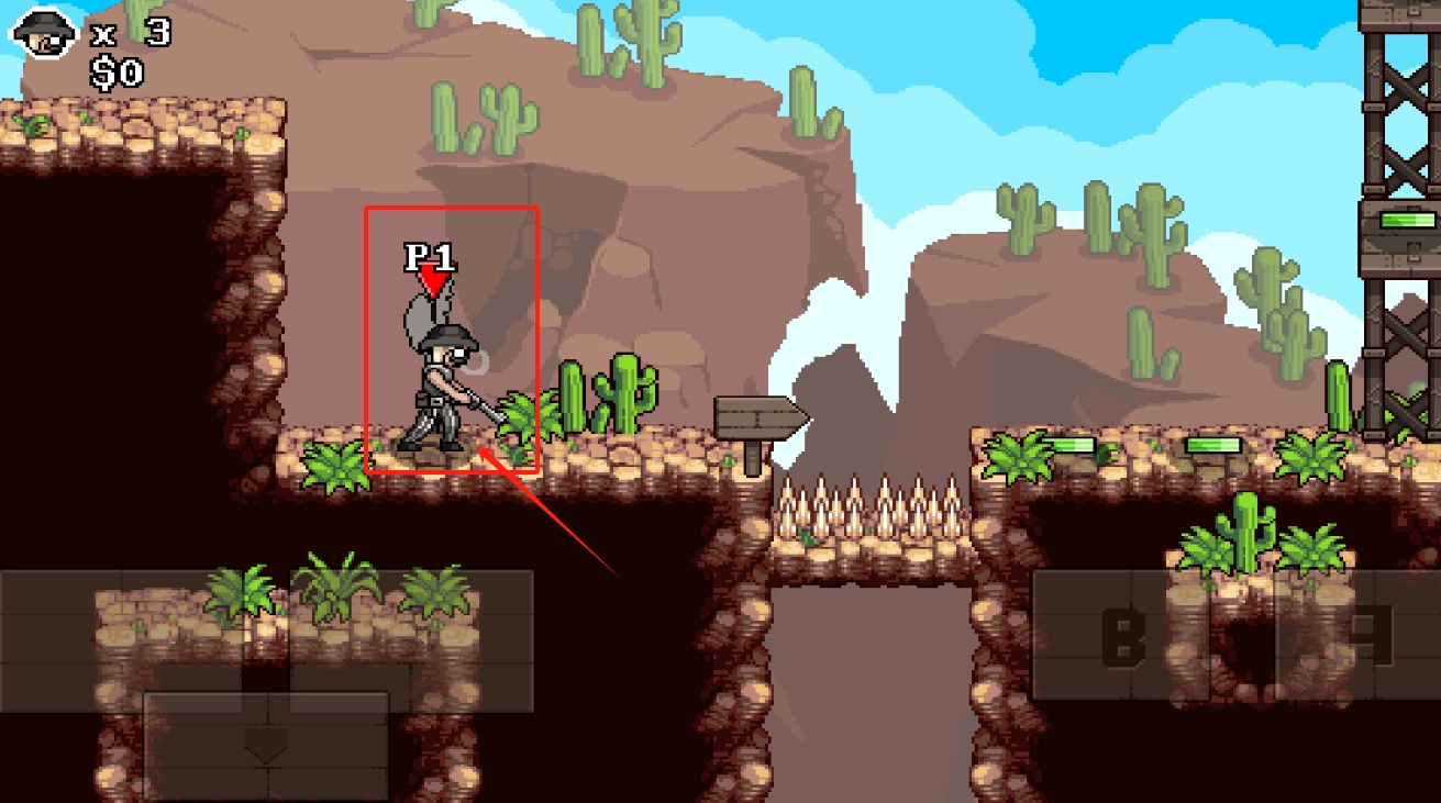3、P1控制角色移动射击,显示3条命和0金钱,B键可能是特殊技能。