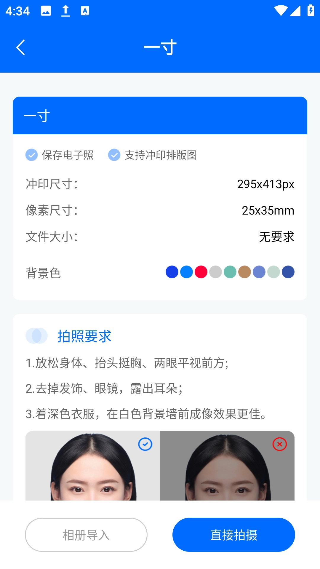 2. 挑选所需的证件照规格与模板,依据指引拍摄照片或者导入图片。