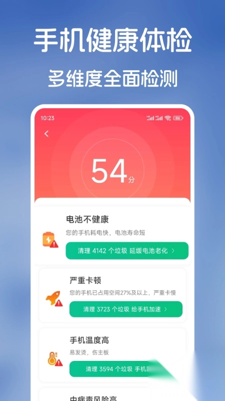2、具备手机健康检测功能,能从多个维度进行全面检查。比如,可查看手机电池使用状况、手机内存占用情形,还能检测是否存在手机病毒风险等。