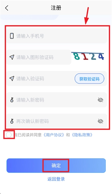 请依次输入手机号、图形验证码、短信验证码以及新密码,随后勾选“我已阅读并同意《用户协议》和《隐私政策》”,最后点击“确定”,操作即可完成。