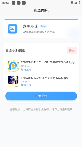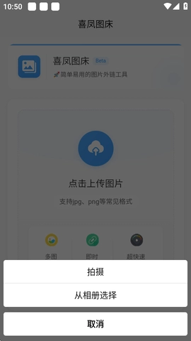 1喜凤图床具备多种上传途径,用户既能够选择直接拍照进行上传,也可以从手机相册里挑选已有的照片来上传。