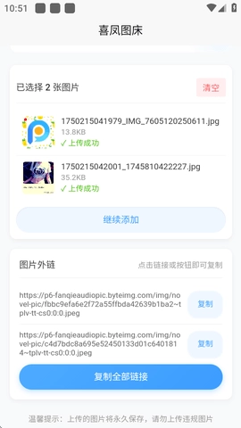 2、用户上传的图片会被迅速传输到云端,上传完成后,软件会自动生成每张图片的分享链接。