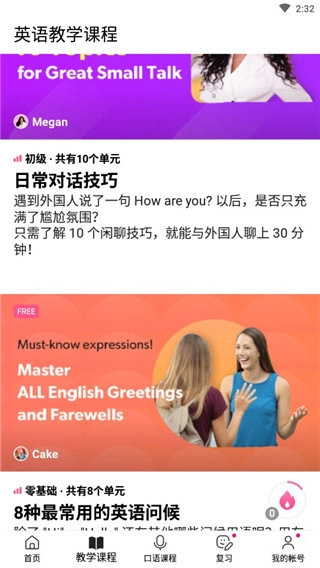 Cake学英语是一款极为出色的免费英语学习软件。它涵盖的学习内容十分丰富,包含教学课程、口语课程,还涉及复习学习板块。其中英语教学课程多样,有日常对话技巧讲解、常用英语问候教学。口语课程也独具特色,并且有众多免费课程供用户选择。无论是零基础的学习者,还是处于初级、中级、进阶阶段的同学,都能在这里找到适合自己的学习内容。它堪称专业的英语学习平台,有英语学习需求的朋友可千万别错过。